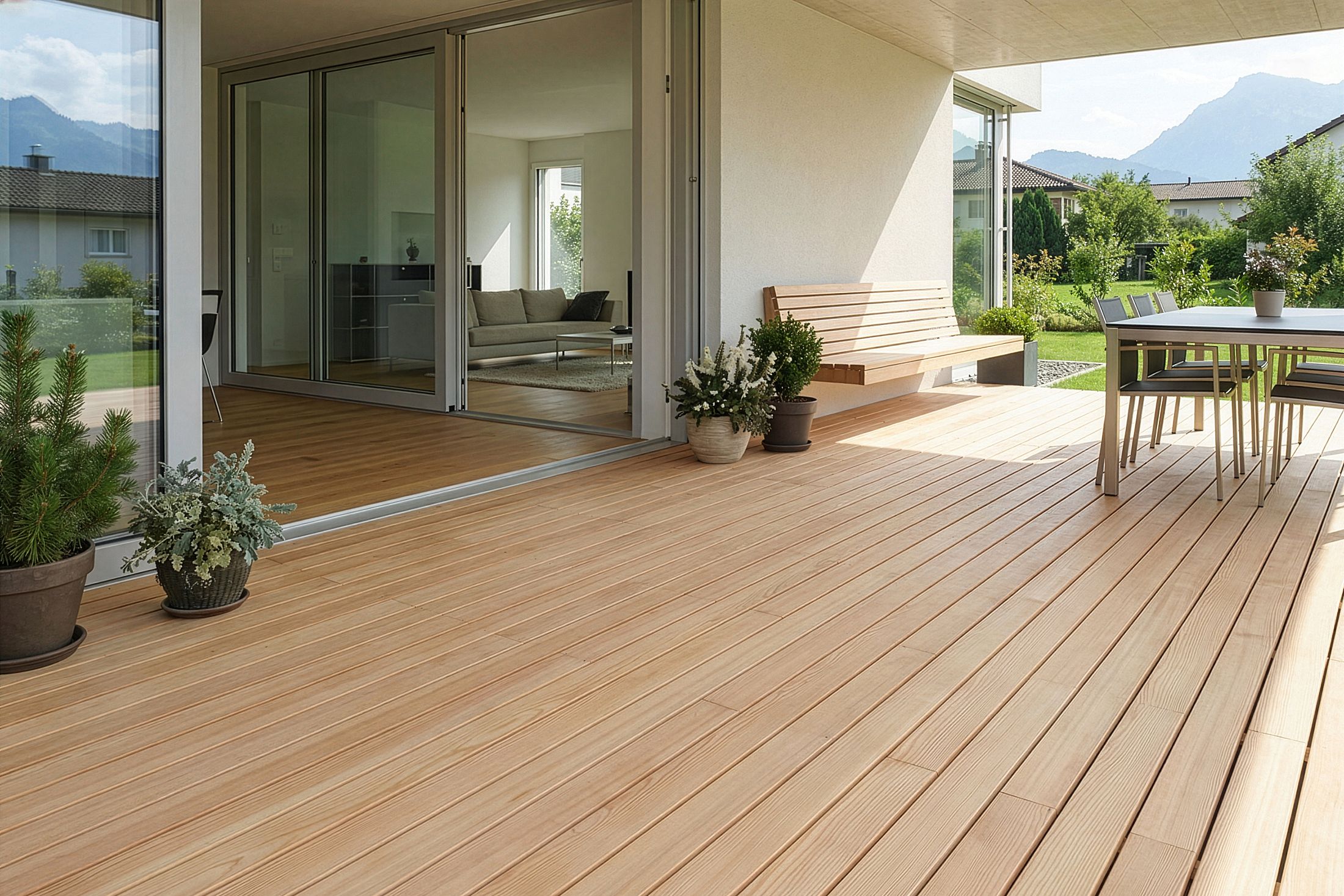 Holz ist nachhaltig. Der in der Natur vorkommende Rohstoff speichert CO2 und zeichnet sich durch eine exzellente Feuchteregulierung aus. Ausserdem besitzen Hölzer beste bauphysikalische Eigenschaften wie eine hohe Tragfähigkeit und geringes Gewicht. Holz-Terrassen wirken gemütlich und bieten ein natürliches Flair. An sonnig-warmen Tagen geniessen Sie ein wohliges Barfussgefühl beim Laufen über Ihre Terrasse. Allerdings eignet sich nicht jedes Holz als Terrassenbelag. Nur hochwertige Terrassendielen aus Holz halten jeder Witterung stand und sind langlebig. Terrassenhölzer wie Teak, Akazie, Kastanie und IPE können auch in feuchten oder schattigen Bereichen eingesetzt werden. Jeder Holz-Terrassenboden ist zudem ein Unikat in Maserung und Farbe.